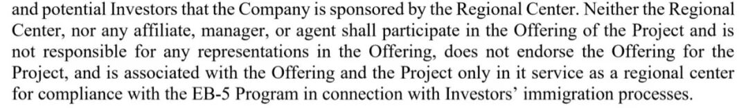 该协议还对ALC Great Plains区域中心的参与程度进行了更加详尽的规定,明确了ALC区域中心,其相关机构,管理人,代理人均不得参与该项目的发行,不对项目发行承担任何责任,不背书该项目的发行,除了满足与申请人相关的EB-5项目合规要求,与该项目及其发行没有任何连带关系(图三) 。