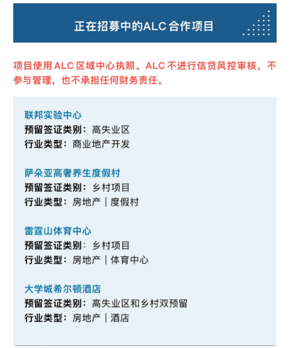 事实上,ALC从未参与过该项目的发行工作,完全没有参与I-956F的准备和申请,更没有参与过雷霆山项目的宣传和推广。这一点在ALC的网站和微信平台上都已经清楚标明(图五) 。雷霆山项目与另外极少数几个租借方项目一起,都被清楚排除在ALC的EB-5项目清单之外。