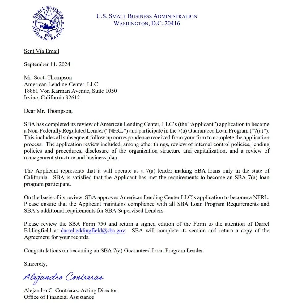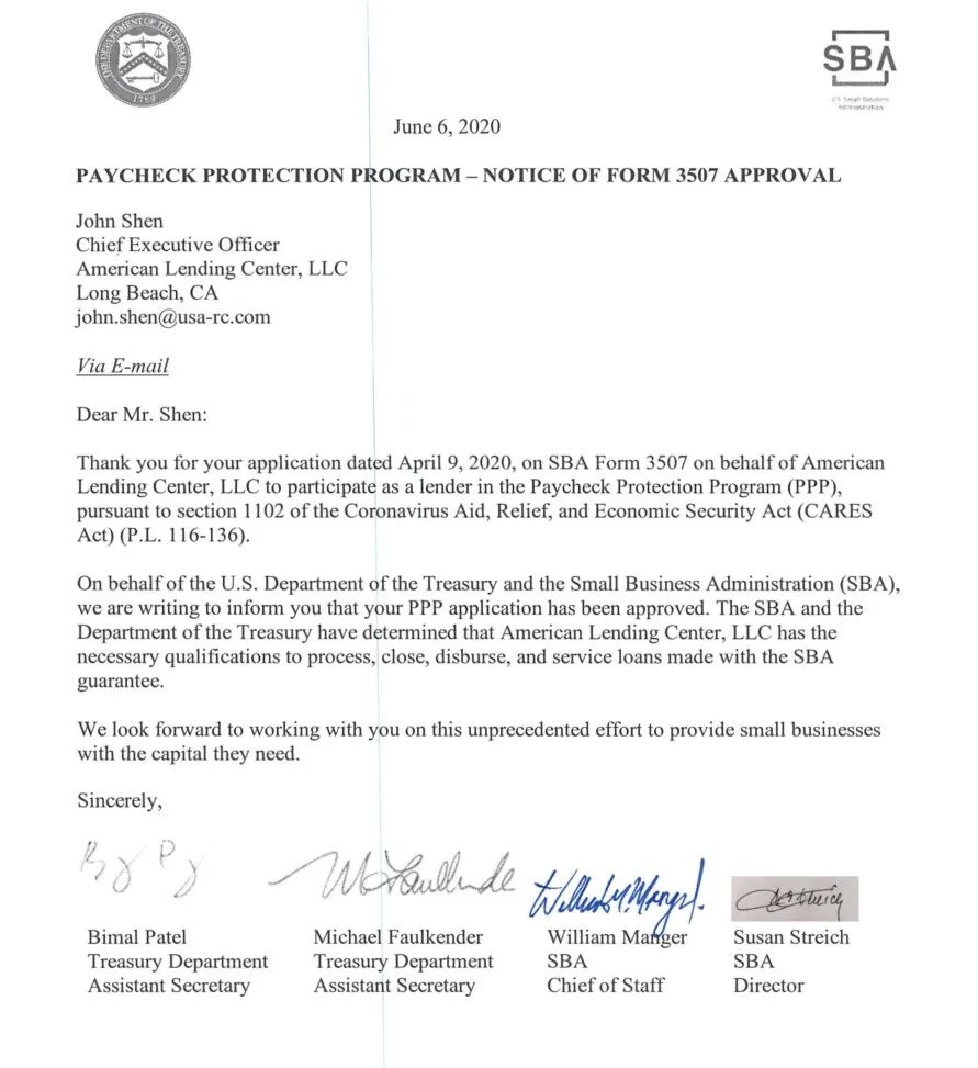 这是新冠疫情下美国联邦政府发放给中小企业的特殊救助贷款项目的执照。有此执照的贷款机构可以协助美国联邦政府把救助款发给符合资格的中小企业,用于支付员工薪资,以维持企业的正常运营。ALC是美国财政部和中小企业局联合批准的非银行,非金融科技公司的两家贷款机构之一。这项特殊政府贷款授权因直接使用联邦政府资金,责任重大,非银行机构获批的难度极大。