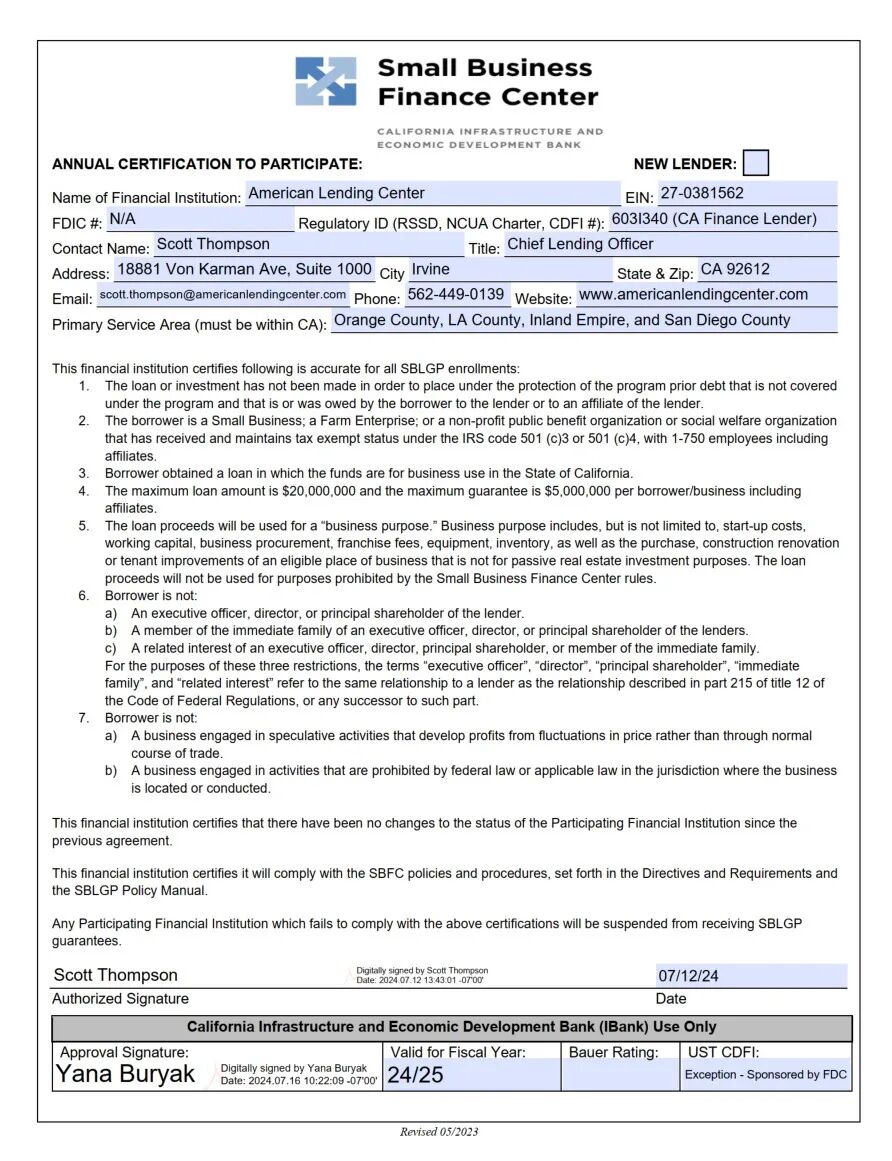 这是美国加州政府批准授权的政府担保贷款机构执照。有此执照的加州贷款机构既有普通银行,也有非银行机构,一共有几百家。这些贷款机构发放的商业贷款,可以经特定审核程序批准,由加州的“基建和经济开发银行” (California Infrastructure and Economic Development Bank, “IBank”) 代表加州政府给贷款提供80%的政府担保。这张执照对贷款机构的资质要求同样很高,没有多年良好的贷款服务记录和强大的信贷风控团队,申请这张执照是无法获得批准的。在美国EB-5行业只有ALC拥有该执照。