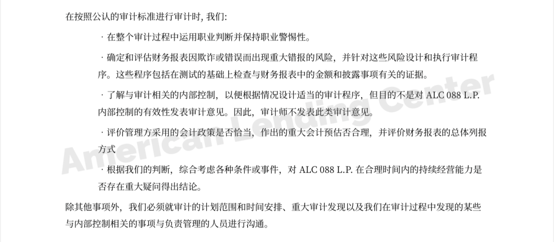 ALC聘请的审计事务所Fineman West & Company(FWC)是一家总部位于美国洛杉矶的知名专业审计公司,也是国际独立会计师事务所联盟成员。FWC作为与ALC没有任何利益关联的独立第三方审计事务所,每年依据美国财务会计准则委员会(FASB)发布的“公认会计原则”(GAAP),对ALC旗下的EB-5基金(有限合伙)进行严格的财务审计。这种专业、独立且权威的审计方式,确保了审计报告的公正性和准确性。